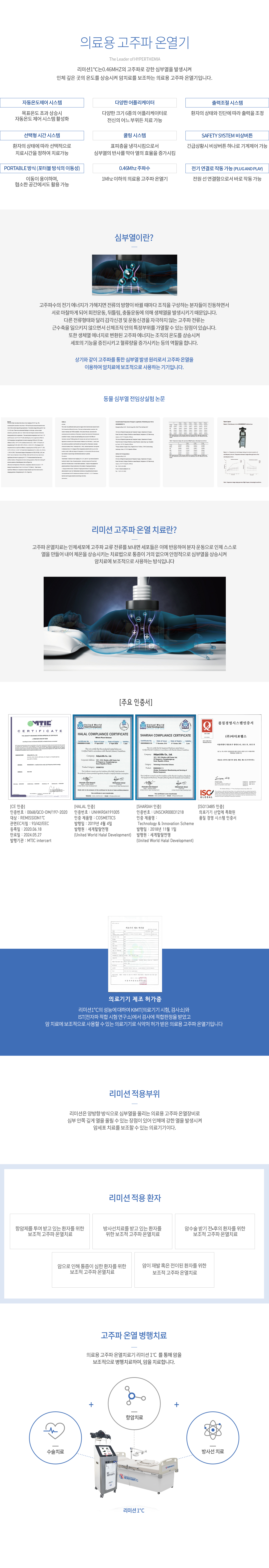 리미션1℃는0.46MHz의 고주파로 강한 심부열을 발생시켜 인체 깊은 곳의 온도를 상승시켜 암치료를 보조하는 의료용 고주파 온열기입니다.고주파 온열을 이용하여 암치료에 보조적으로 사용하는 기기
